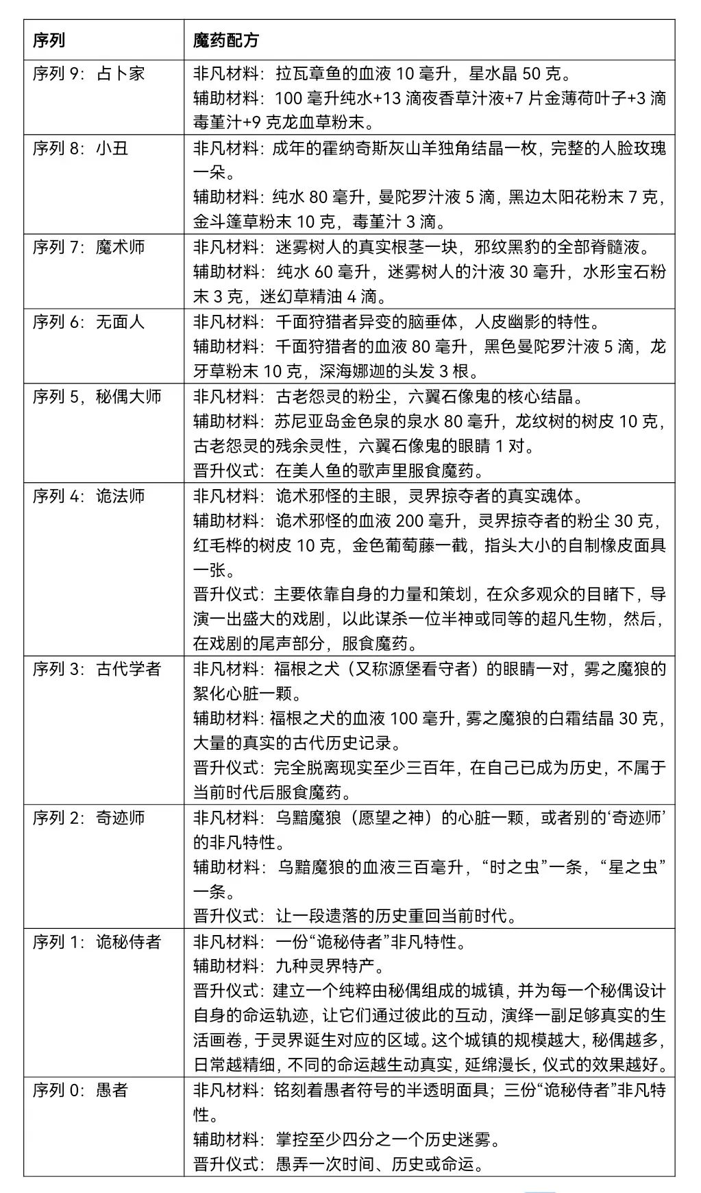魔藥配方構成的“魔藥體系”,則體現了“虛擬物體系”的另一個特征:序列性。魔藥配方是人物的升級材料,與每條“神之途徑”當中的10個序列一一對應,呈現出非常完整的序列性特征:
