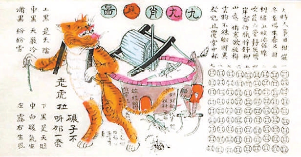銅錢型消寒圖流傳在民間,式樣也變得更加多樣,人們往往會在一連串銅錢邊上添上一些圖畫,寫上幾句風趣之語,讓隆冬的生活變得“有說有笑”。比如河北武強年畫《九九消寒圖》,畫面右側是八十一個銅錢圖樣,中部畫著一個“老虎拉碾子”的形象,還有一句歇后語“老虎拉碾子——不聽那一套”。右上側則寫有唐代杜甫的詩歌《小至》:“天時人事日相催,冬至陽生春又來。刺繡五紋添弱線,吹葭六管動浮灰。岸容待臘將舒柳,山意沖寒欲放梅。云物不殊鄉國異,教兒且覆掌中杯?!?/p>