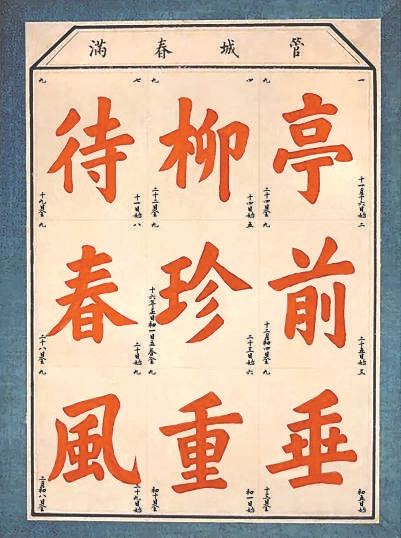 游戲者每日用紅色或彩色筆描填一筆,九個字填滿正是冬盡春來之時。最流行的九個字是“亭前垂柳珍重待春風”,此外還有“春前庭柏風送香盈室”“故城秋荒屏欄秋枯榮”“雁南飛柳芽香便是春”“待柬春風重染郊亭柳”“庭前春幽挾草巷重茵”“亭前屋后看勁柏峰骨”等等,以上每句的九個字的繁體都合九之數,現代人也創作了簡體筆畫合乎九的句子,如“幽柏姿美濃蔭待春榮”。各句文字雖然不同,表達的都是盼春、迎春之意。