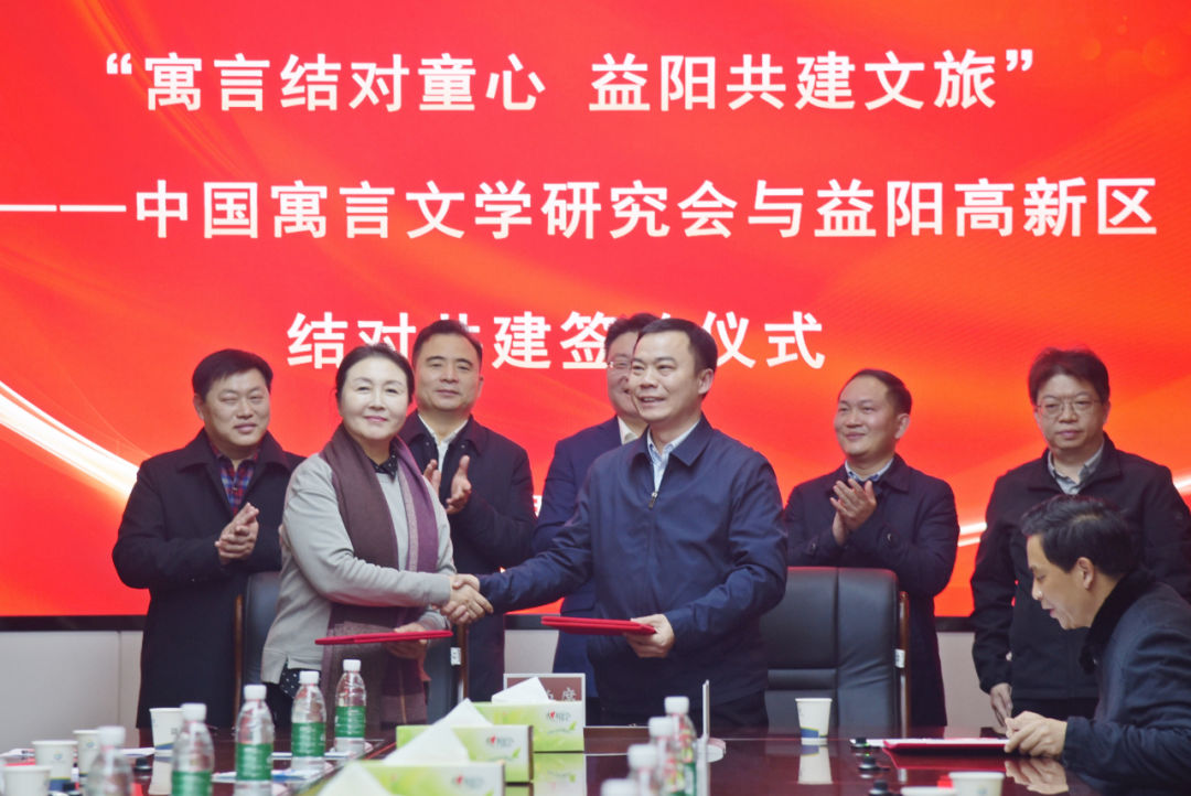會后,還舉行了“寓言結對童心 益陽共建文旅”中國寓言文學研究會與益陽高新區結對共建簽約儀式。肖驚鴻、喻理科分別代表雙方正式簽約,劉益希主持簽約儀式,李曉東、汪軍、劉戈、謝樂軍、包后勇等共同上臺見證。雙方將積極推進多項合作,開設文學專題講座、建設中國寓言文學研究會兒童書屋、深入文學調研走訪、開展寓言童話進校園活動、舉辦全國兒童文學類頒獎或賽事等,助力清溪村開創更具辨識度的新文化,努力將中國寓言以更為豐富、嶄新的形式呈現在大眾面前。