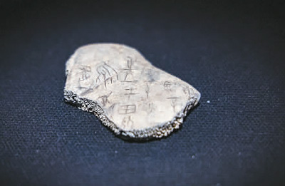 “殷墟甲骨”專題展上的“甲骨2174”,左上為甲骨文“兔”。