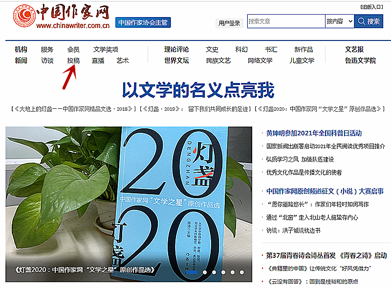 1、首先登錄中國作家網http://www.jchcpp.cn/ 在首頁頂端頻道分類位置找到“投稿”(標紅色箭頭處),點擊進入原創頻道。