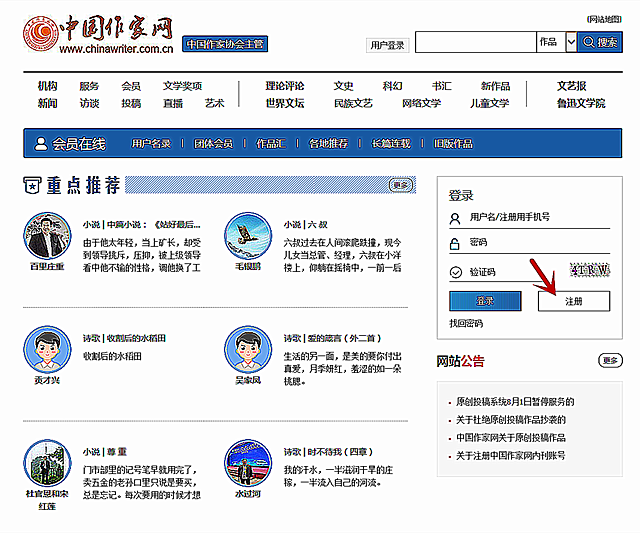 2、在原創頻道頁面右側原創會員登錄區域找到“注冊”(標紅色箭頭處),點擊方可進入用戶注冊頁面。
