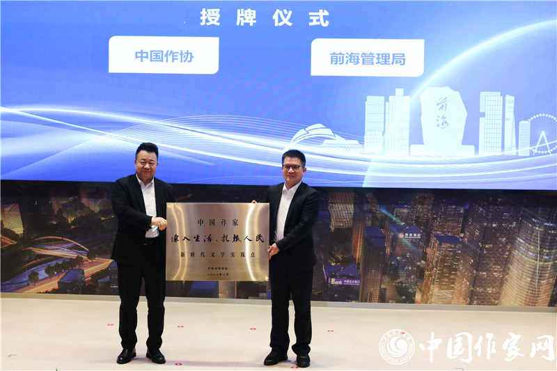 邱華棟代表中國作協授予中國作家“深入生活、扎根人民”新時代文學實踐點牌匾,王錦俠代表深圳市前海管理局接牌