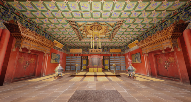 要進入這座沉浸式數字空間,體驗者需手持手機,打開“數字貓”APP,觸碰內嵌NFC芯片的古建修繕館“妙頂金龍”黃銅守護令牌,即可用唯一識別身份激活令牌,跨越手機屏幕中虛實交融的“能量穿越門”,邁進按照1:1原尺寸大小所搭建的故宮養心殿“紫禁妙境”元宇宙。