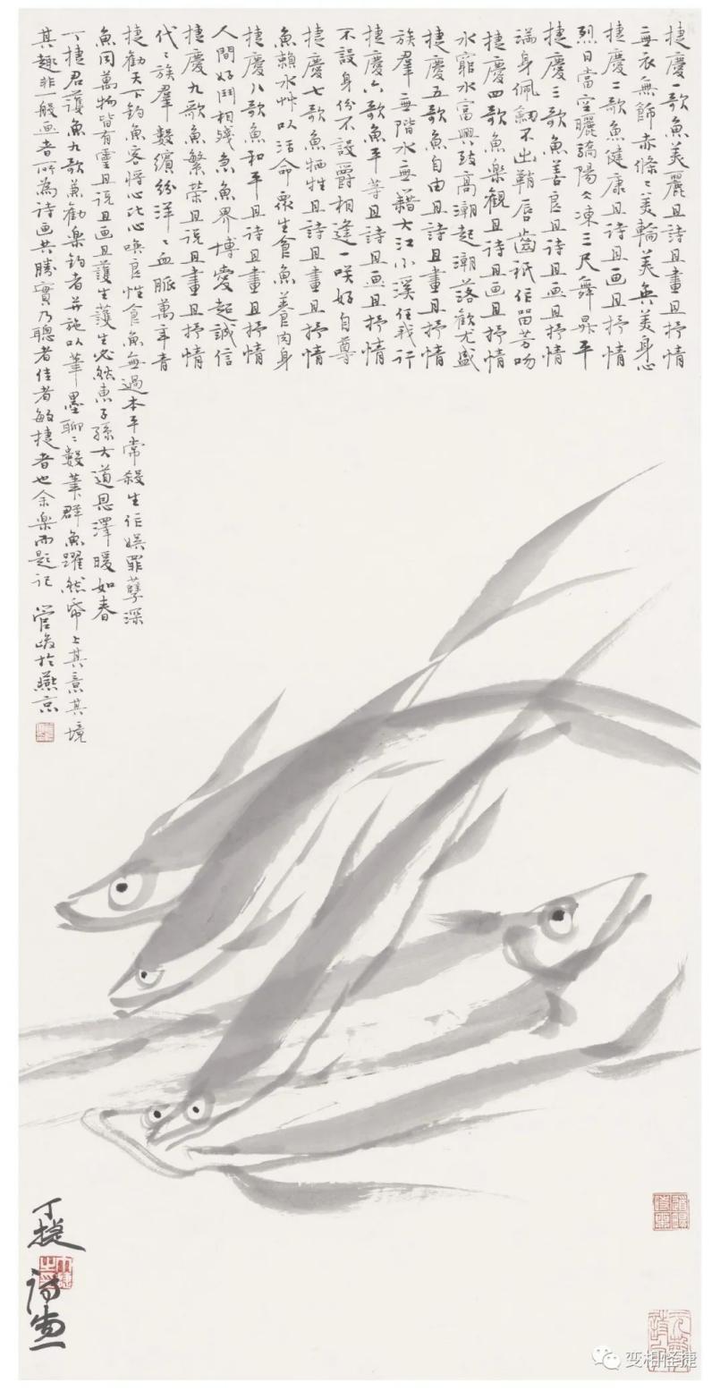 魚題材繪畫是丁捷繪畫中的首要內容,魚甚至成為他的藝術符號,貫穿在他的多種形式繪畫探索中。著名書法家、中國書法院院長管峻先生對此驚嘆不已,他興奮地在丁捷的一幅《護魚畫》上題寫了四百多字,說道:“丁捷君施以筆墨,聊聊數筆,群魚躍然紙上,其意其境其趣非一般畫者所能為。詩畫共勝,實乃聰者佳者敏捷者也?!?/p>