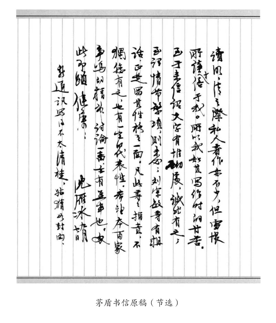 茅盾書法根底深,結體平正勻稱,得歐體娟秀之美,線條修長,筆筆送到,出鋒露鋒明顯,個性風格突出,書卷氣充盈,是文人書法代表,也是無意作書家乃成書家的典型。該信正是其個人風采的代表。全信字體舒展秀美,清爽悅目。