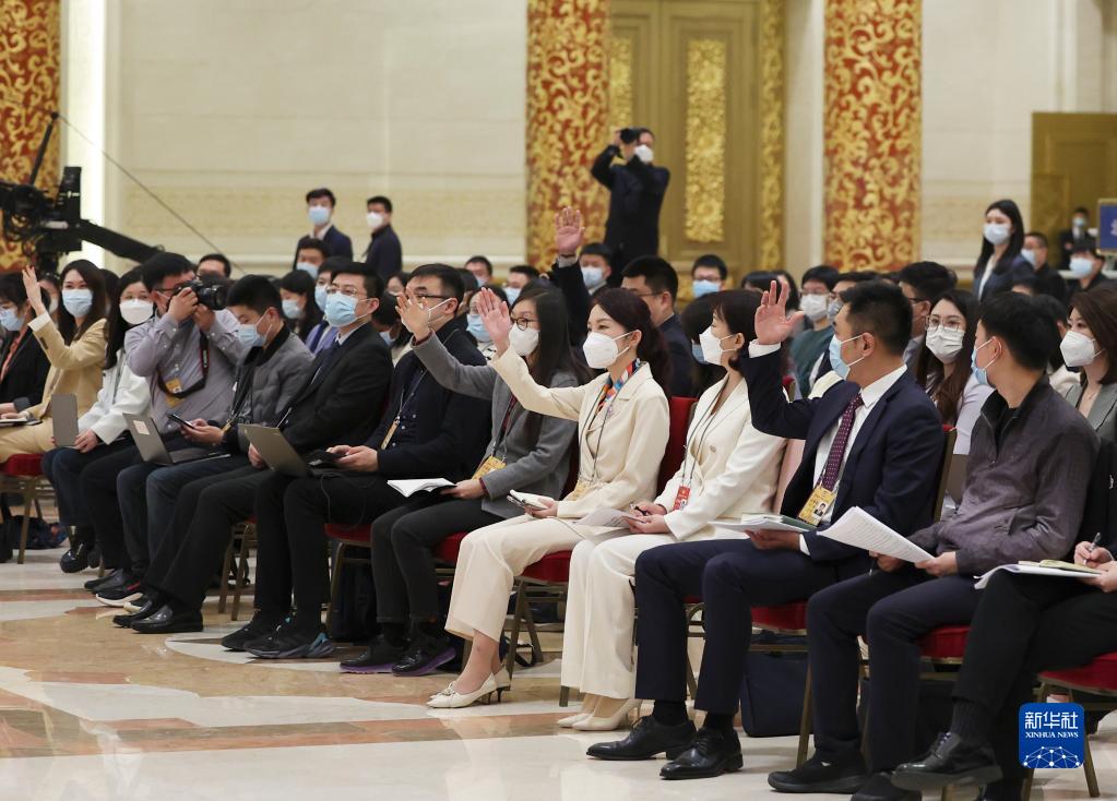 3月5日,全國政協十四屆一次會議在北京人民大會堂舉行民主黨派中央和全國工商聯領導人記者會。這是記者在舉手提問?!⌒氯A社記者 曹燦 攝