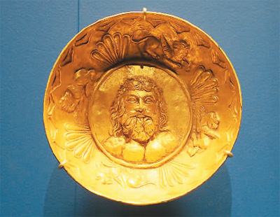 在展覽第一單元,一件華麗的酒神金碗格外引人注目。金碗浮雕有四頭翼獅與四蕨類葉片,中央頭像呈希臘貴族面相,眉骨隆起,雙眼圓睜,絡腮胡濃密,長發垂肩。依據發上所飾葡萄葉,專家判斷其為古希臘神話中的酒神狄俄尼索斯,他是宙斯之子,護佑著希臘的農業與戲劇文化。