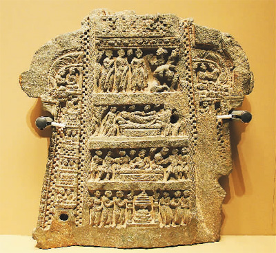 佛傳故事是犍陀羅藝術的經典題材。來自白沙瓦博物館的佛傳故事浮雕造像龕從上到下刻畫了離開毗舍離城、佛陀涅槃、分舍利、起塔供養4個場景,這樣嚴格按照時間順序表現佛傳故事的作品較為少見。