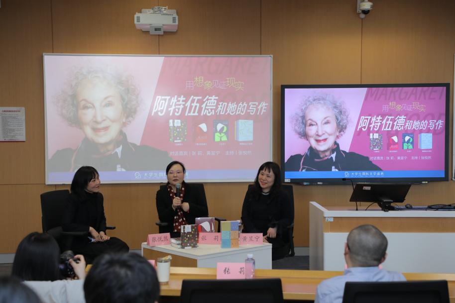活動現場,北京師范大學文學院副院長張莉和上海譯文出版社副總編輯黃昱寧圍繞“用想象見證現實:阿特伍德和她的寫作”展開對談,中國人民大學文學院副教授張悅然主持活動。張莉認為,阿特伍德是我們這個時代最好的作家之一,她用女性視角對人類的生存境遇進行了總體觀照,擴大了加拿大文學在世界范圍的影響力。黃昱寧談到,隨著年歲漸長,阿特伍德的寫作之路越來越寬闊。但無論是女性主義還是科幻題材,阿特伍德的寫作都與現實息息相關,她用貌似發生在未來的故事書寫身邊的現實。張悅然則表示,阿特伍德的小說之所以有未來感和預言性,是因為她寫的故事本來就能穿越時空,不然不會被讀者看到,這是阿特伍德給今天寫作者的重要啟示。她期待年輕的寫作者能讓他們的作品穿越過去,乘著文學的穿梭機有一天去到阿特伍德的世界。