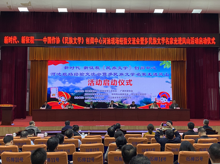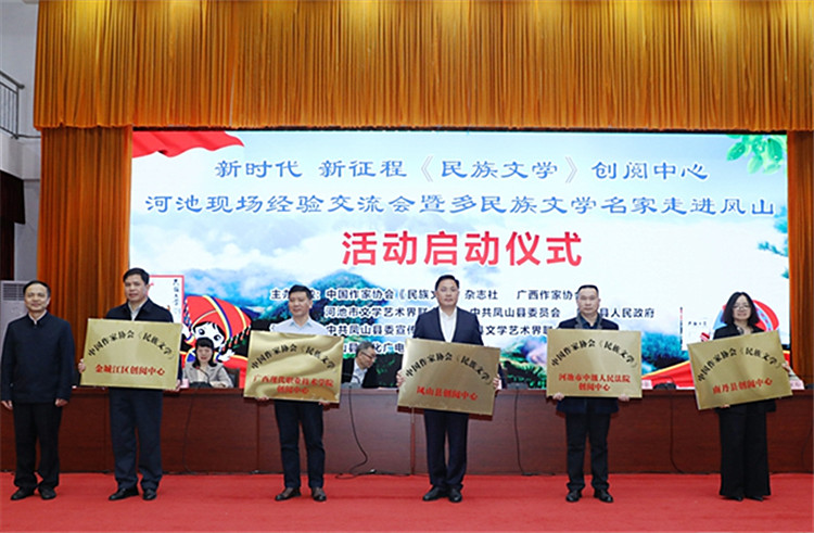 3月31日至4月3日,由《民族文學》雜志社、廣西作家協會、廣西河池市文聯,中共鳳山縣委、縣人民政府主辦的“新時代 新征程——《民族文學》創閱中心河池現場經驗交流會暨多民族文學名家走進鳳山”活動在廣西鳳山縣舉行。中國作協黨組成員、副主席、書記處書記陳彥,《民族文學》主編石一寧,廣西文聯主席、作協主席東西,中共河池市委常委、宣傳部長孔獻玲,河池市文聯黨組書記、主席潘紅日,《民族文學》副主編楊玉梅,中共鳳山縣委書記薛海源、縣人民政府縣長楊勝濤、縣人大常委會主任羅國照、縣政協主席韋海山,縣委副書記黎舉孟,以及牙韓彰、潘靈、石朝雄、興安、巴桑、韋秀觀、李卓瑪等多民族作家,《民族文學》創閱中心負責人及作家代表,河池市和鳳山縣作家代表、部分文學愛好者參加本次活動。