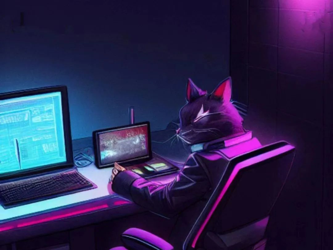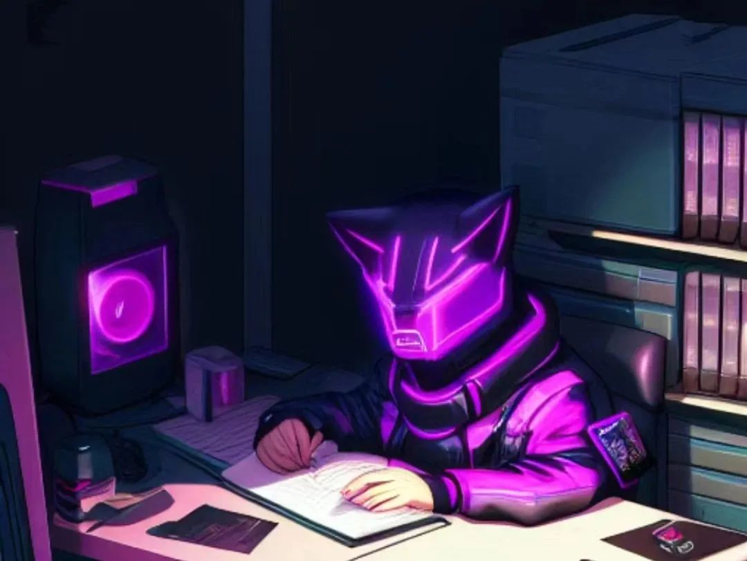 AI圖像生成:一只賽博朋克風格的貓在書桌前寫小說