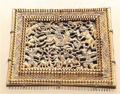 來自寧夏回族自治區鹽池縣博物館的狩獵紋金方奇,雕刻十分精美,主體畫面表現狩獵場景,造型風格與薩珊王朝金飾頗為相近。根據背面銘文可知,這是十六國時期南匈奴之遺物。
