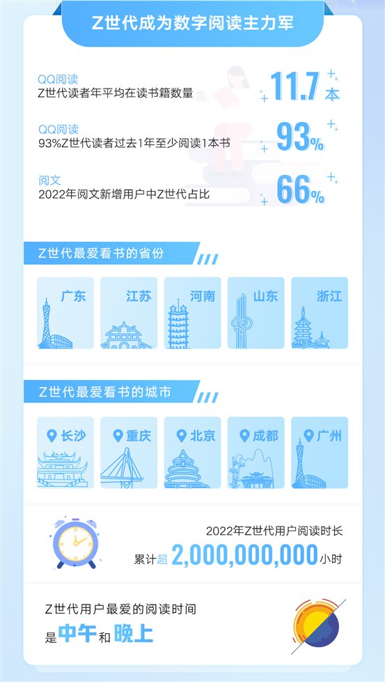 《Z世代數字閱讀報告》顯示,Z世代的閱讀畫像為數字閱讀“隨時隨地”的特性,增添了更多可供解讀的新意:從時間上看,2022年,Z世代閱讀時長累計超過20億小時,相當于讀完2000萬本《史記》的時間。Z世代最愛的閱讀時間是中午和晚上,中午12點和晚上10點是閱讀高峰期;從地域上看,廣東、江蘇、河南、山東和浙江位列Z世代最愛讀書省份TOP5,長沙、重慶、北京、成都、廣州則躋身Z世代最愛讀書城市。
