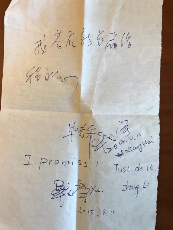 “當時喝到一半,很歡快?!背逃佬赂嬖V澎湃新聞記者,“我說‘你的新長篇要給我啊’,畢飛宇喝大了,就說‘好呀’,我趕緊拿出一張餐巾紙,在上面一字一字寫下‘我答應新長篇給程永新’,署名‘畢老爺’。然后我把紙交給他,他就在紙上簽了自己的名字,還寫了行英文‘I Promise’?!?/p>