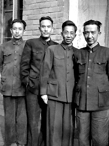 1951年,北京東總布胡同22號中華全國文學工作者協會大院內蕭殷住所門前合影。左起:艾蕪、張天翼、蕭殷、沙汀。