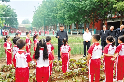 隨后,習近平來到學生農場。這里是學生開展農業種植活動的實踐場所,陽光下、田壟上,一排排綠油油的菜苗生機勃勃。孩子們拿著水桶、鏟子、耙子、毛筆,為西紅柿、黃瓜等澆水、松土、除草、授粉。習近平強調,很多知識和道理都來自勞動、來自生活。引導孩子們從小樹立勞動觀念,培養勞動習慣,提高勞動能力,有利于他們更好地學習知識?,F在一些城里的孩子接觸農村、接觸大自然少,不光“四體不勤”,而且“五谷不分”,對吃的是什么、從哪里來的、怎么來的都不知道,更體會不到“誰知盤中餐,粒粒皆辛苦”。他對同學們說,認識大自然,首先要從認識身邊的植物開始。同學們栽培的各種植物,雖然書本上都有介紹,但大家親手種、親自培育、跟蹤觀察,收獲肯定是不一樣的。希望同學們從“學農”中感受到農作的艱辛和農民的不易,從小養成熱愛勞動、珍愛糧食、尊重自然的良好習慣,為建設美麗中國作貢獻。新時代生態文明建設要從娃娃抓起,通過生動活潑的勞動體驗課程,讓孩子親自動手、親身體驗、自我感悟,讓“綠水青山就是金山銀山”的理念早早植入孩子的心靈。