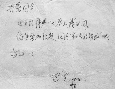 巴金先生的前后發表的兩篇散文,都附有字數不多的短信,可以說是“便條”,從字跡來看,前者流暢,后者潦草。我注意到巴金在后一封信簽署日期時,把“卅日”改為“卅一日”,猜想那篇散文可能在子夜時分修改完成的?!鞍徒鹑沼洝庇涊d:“《文匯報》送來昨天發言稿的校樣。修改校樣,并起草在政協學習會上的發言稿,寫到十點后不到四頁,疲憊不堪?!保?月30日日記)“八點后校改發言稿,九點后《文匯報》小武取去校樣,送來讀者信十五封”(6月 1日日記)