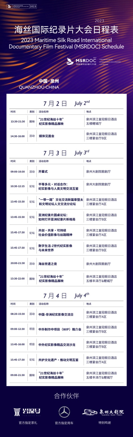 7月3日,由國務院新聞辦公室、國家互聯網信息辦公室、國家廣播電視總局、福建省人民政府指導,中國外文局、福建省人民政府新聞辦公室、福建省廣播電視局、泉州市人民政府主辦的2023海絲國際紀錄片大會在福建泉州開幕。大會為期4天,聚焦“弘揚海絲精神,記錄時代變遷”,致力于搭建開放、合作、互利、共贏的紀錄片國際交流平臺,受到國內外業界廣泛關注和歡迎。
