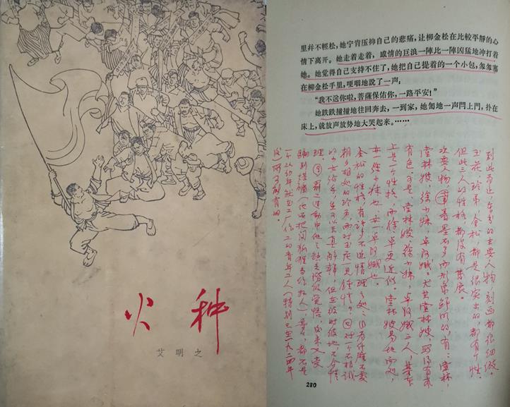 眉批本中的內容主要以長句和段落組成,段落獨立成端,多個長句多頁分布也可構成段落,主要分布在書的空頁、封面、封底、封背、扉頁,一個單獨的段落往往在百字之上,多個段落首尾連接后字數往往在數百字到千字之間,具備“札記”特征。以札記為主的眉批本其札記內容往往會形成一篇評論文章或者會議講稿的一個部分。如眉批本艾明之《火種》中就有札記十余處,與之對應的是茅盾在《收獲》上公開發表的關于《火種》的評論文章。