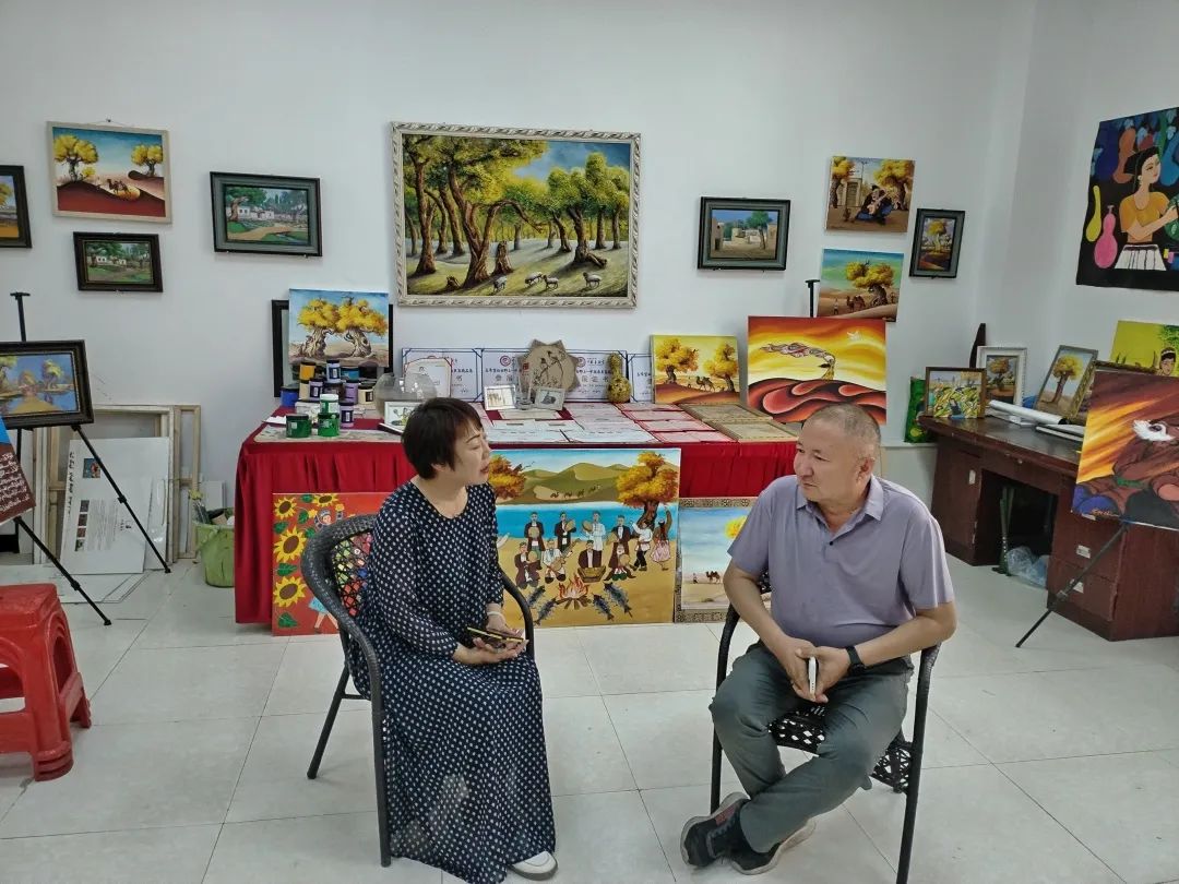 由新疆作家協會推薦選派的烏魯木齊作家段蓉萍走進新疆喀什地區麥蓋提縣刀郎農民畫鄉,參觀農民畫展廳,采訪農民畫畫家米娜瓦爾·木臺力甫、西爾艾力·艾買提、木卡熱甫江·艾海提等,深入了解了該縣農民畫起源,藝術特點,發展現狀等情況。