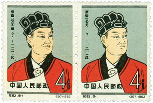紀—92中國古代科學家(第二組)蔡倫郵票錯版(左)與正版(右)