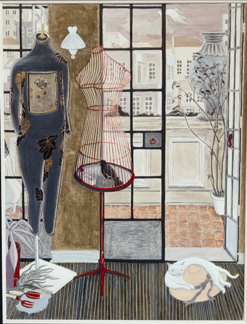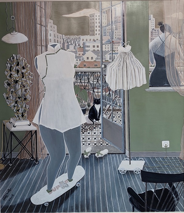 金宇澄的近作《陽臺》,這張作品取自1940年代鄔達克設計的“愛神花園”,也是金宇澄最熟悉的上海作家協會局部,提供另一種觀看世界的特殊樣式。透過窗格望向街道對面的洋房,房間里面的模特衣架猶如被剝去外衣的赤裸男女立在陽臺的門前,而豐滿女模特衣架被做成了鳥籠,一只烏鴉安靜地站在鳥籠里面,鳥籠外面是慵懶的白貓在打盹兒,氣宇軒昂的一對模特衣架仿佛是要出門參加派對的紅男綠女,殘敗的蕨類植物被凌亂無序地切割下來,扔在精致的地毯上面。
