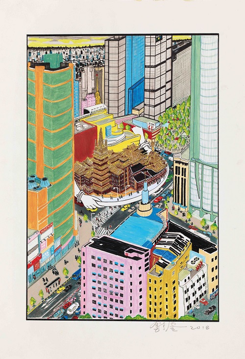 作品《靜安寺》繪制的是金宇澄生活、工作的靜安區。他說,我畫靜安寺,發現靜安寺周邊都是新蓋的房子。靜安寺很熱鬧,我畫它才醒悟,只有“百樂門舞廳”著名的灰藍色塔尖,以及靜安公園正門兩排大梧桐,畫外遠處張愛玲故居,這老三樣。