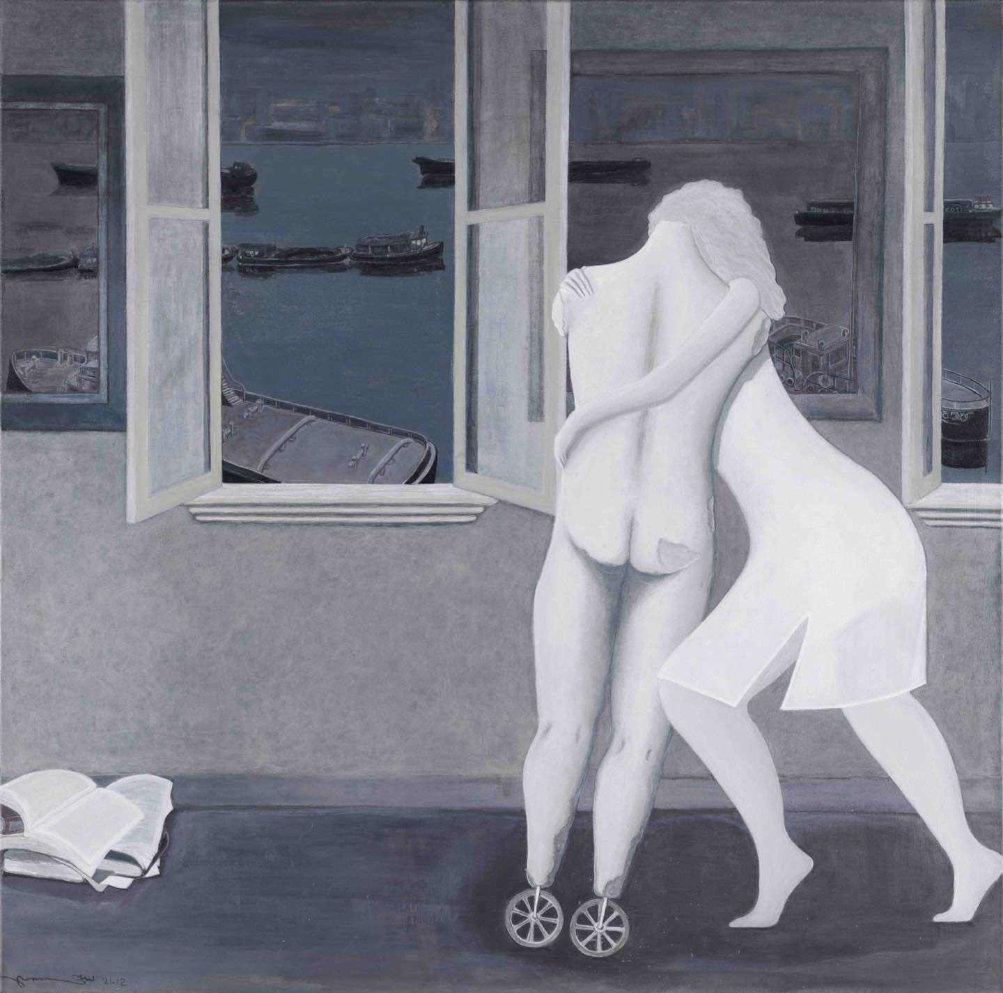 《北風》為俯瞰上海大廈背面那整幅街景,與一般表現不同,體現鱗次櫛比的城市魅力,是在黑白灰的配色中,亦真亦幻,意味異常繁復,屏風式的三聯畫,沒有光影,幾乎都是平面,卻也很立體。白雪覆蓋的城市顯現一種童話式的不真實、不對應的恍惚感,安靜的車道,兩旁店面和樓房,仿佛都在夢中?!澳敲炊嗟膮柡θ宋?,都會來到這座城市,上海是個大染缸,是真的,只要他來這里生活,就會染上它的特征,畫中的每一棟樓,每座公寓,每扇窗戶背后,在發生著一些什么,你知不知道?你不知道?!辈恢赖氖?,最有意思。