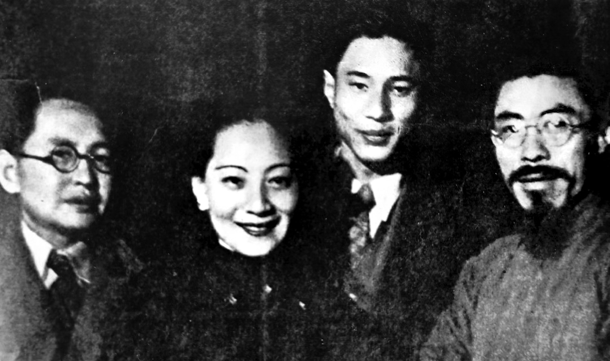 話劇《祖國》主創人員。右起聞一多、孫毓棠、鳳子、陳銓(1939年,昆明)