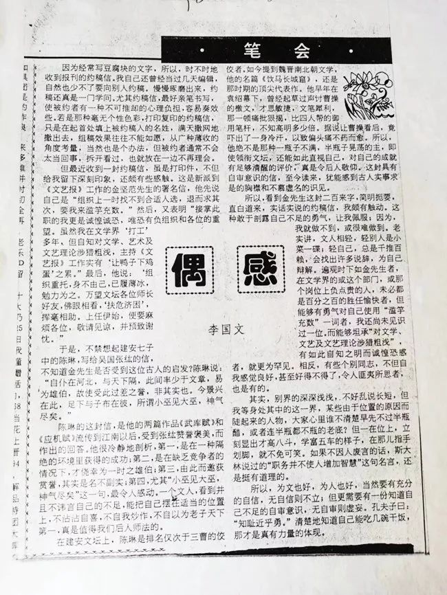 李國文兄收到信后,寫了《偶感》一文,刊發于1998年10月13日的《文匯報》,給我以莫大的鼓勵?,F將《偶感》全文抄錄于下,以示對國文兄的深切懷念——