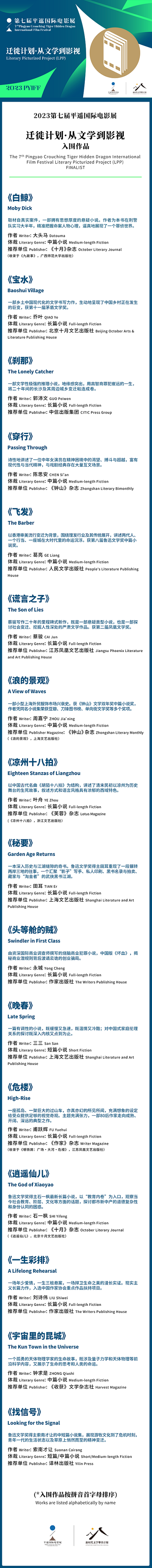 入圍作品囊括了近三年極具影視改編潛質且尚未進行任何影視化開發的文學精品,以中、長篇小說為主,涵蓋懸疑、喜劇、犯罪、科幻、愛情、歷史等多種類型。