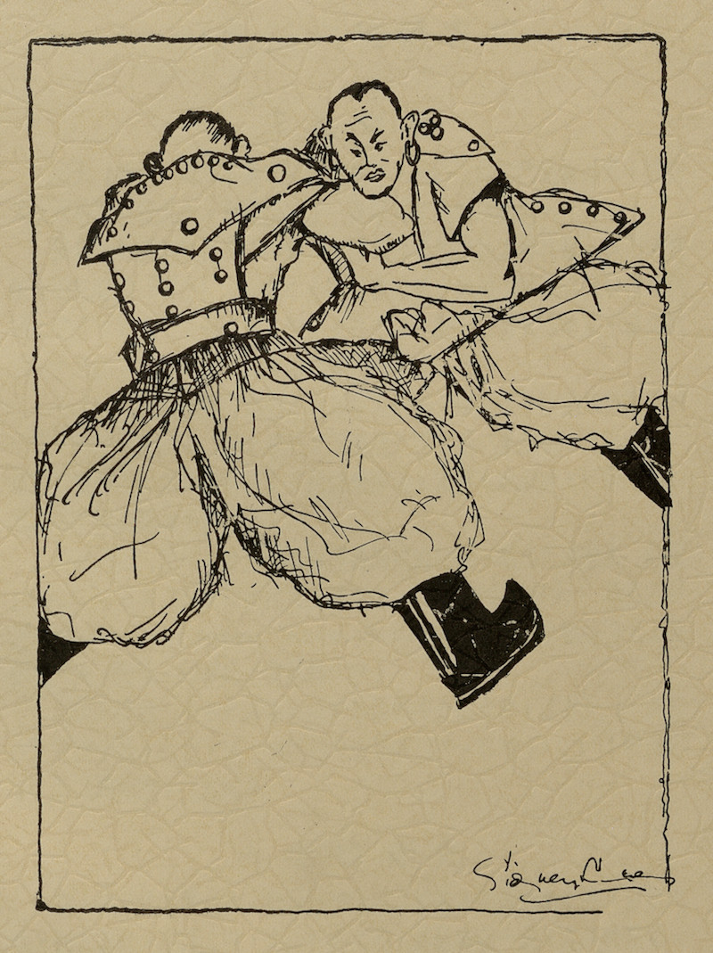 這兩幅畫有很濃的裝飾色彩,比較像版畫。版畫線條收筆的地方多是尖的或是方的,有斬釘截鐵之氣,而這兩幅畫的筆觸比較軟,可能并非是版畫,而是仿照版畫風格的繪畫。