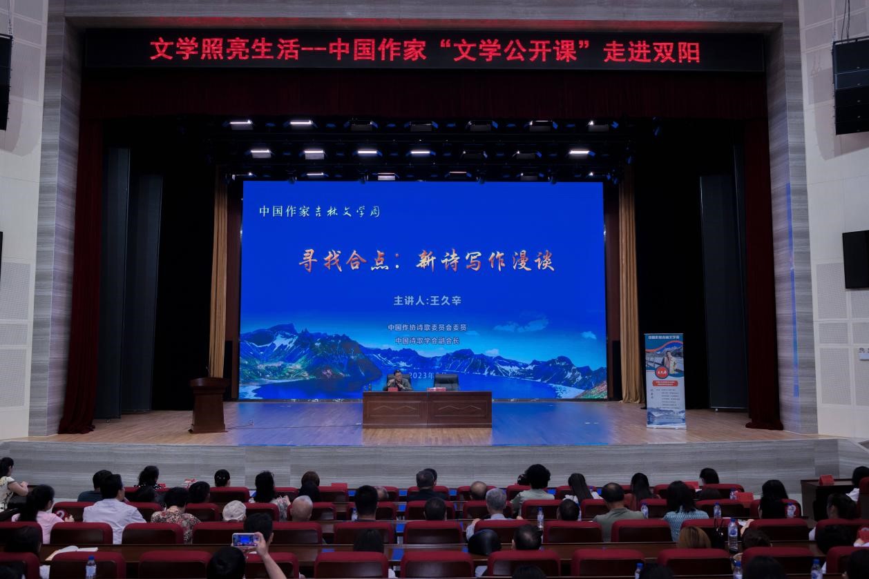 在長春雙陽區委黨校大教室,王久辛以“尋找合點:新詩寫作漫談”為題,結合個人創作經歷,向現場的文學愛好者們闡釋了新詩創作如何尋找“合點”、怎樣就“合點”寫出有爆發力的好作品等話題,并分享了自己在詩歌創作中的感悟和體會。他以自己創作長詩《朱凡》《大地夯歌》《零刻度》《肉搏的大雨》《初戀杜鵑》時的創作歷程為切入點,指導大家在詩歌創作中要注重“寫境”和“造境”,并把修辭和邏輯作為詩歌創作的基本功。大家就詩歌的創作要求、評判標準以及詩歌的時代責任與擔當等問題提問,王久辛一一給予解答,并鼓勵文學愛好者們要立足本土文學,堅定文化自信,創作出具有地域特色、彰顯文化擔當的佳作。