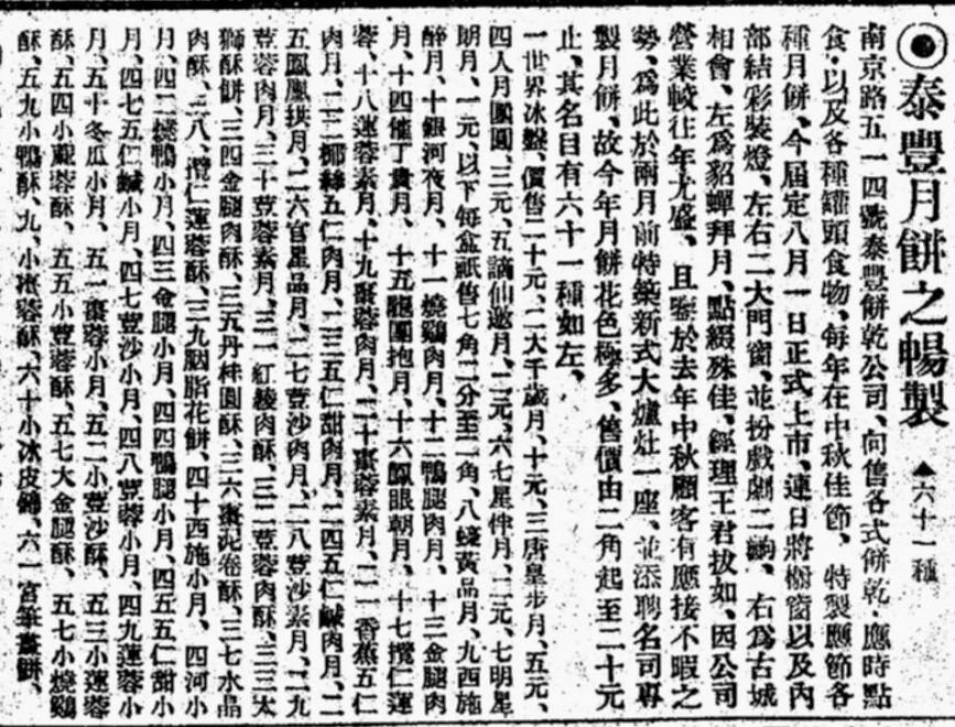 南京路五一四號泰豐餅干公司,向售各式餅干,應時點食,以及各種罐頭食物,每年在中秋佳節,特制應節各種月餅,今屆定八月一日正式上市,連日將櫉窗以及內部結彩裝燈,左右二大門窗并扮戲劇二出,右為古城相會,左為貂蟬拜月,點綴殊佳。經理王君拔如因公司營業較往年尤盛,且鑒于去年中秋顧客有應接不暇之勢,為此于兩月前特筑新式大爐灶一座,并添聘名司,專制月餅,故今年月餅花色極多,售價由二角起至二十元止,其名目有六十一種(統計標號有誤,事實上有六十二種)如左: