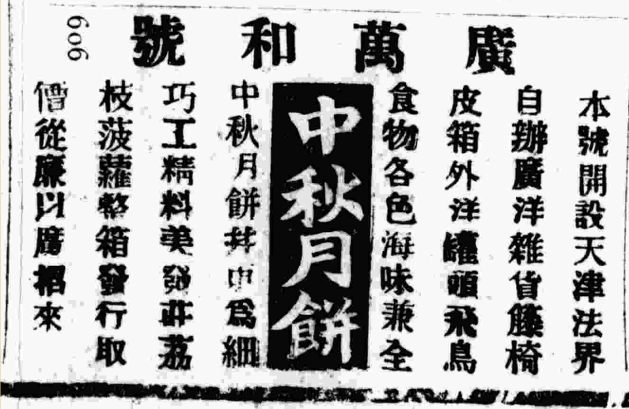 上海如此,省港如此,在另一重要通商口岸天津也是如此。起初是廣貨店兼營月餅,但在廣告版面上已經著重突出,如《大公報》天津版1905年8月15日第4版廣萬和號的“中秋月餅”廣告:“本號開設天津法界,自辦廣洋雜貨、藤椅皮箱、外洋罐頭、飛鳥食物,各色海味兼全,中秋月餅并重……”“中秋月餅”,大字置于廣告正中。