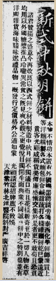 再如廣吉祥號《大公報》天津版1906年9月12日第4版的廣告,則直接以《新式中秋月餅》為題,突出其機器制造特色,誠可謂開新式月餅風氣之先:“本號不惜功本,置有外國機器,聘請旁通泰西化學餅師,選買上等洋面,精制各式面包餅食、咸甜疏打、各樣罐頭餅干,已蒙遠近足額光顧,咸稱貨美價廉,感慚交集。于是更不敢茍且,恐負諸君贊揚之成意,今再改良,以西式餅之材料制造中秋月餅,不獨適口,而且花樣新奇,至于一切人物花草,均用以外國糖漿推凸,玲瓏異常,食之既見爽心,觀之更覺悅目,獨開生面,與眾不同,誠為餅中之特別也。并有洋廣雜貨,海味臘味,送禮品物,一概發行,定價格外公道。如蒙光顧,請認招牌,庶不致誤。天津紫竹林北洋醫院斜對門廣吉祥啟?!?/p>