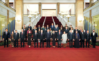 習近平和彭麗媛熱情迎接外方領導人夫婦,同他們一一握手,并集體合影留念。