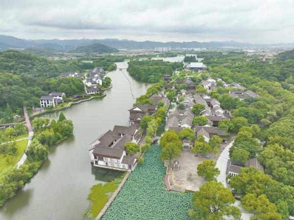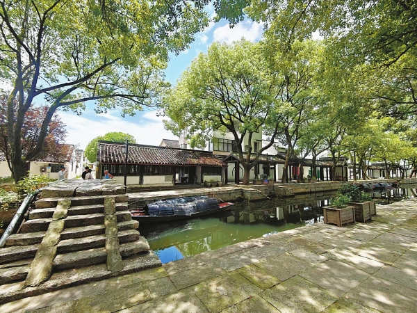 寬闊平整的街道和水光瀲滟的河道,串聯起471幢粉墻黛瓦的江南民居,幾步一景,如同江南園林。