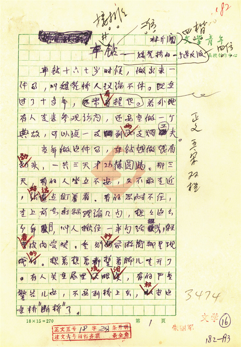 《溪鰻》手稿27頁,《車鉆》手稿25頁,作者均用藍色圓珠筆書寫在“文學青年函授創作中心”“18×15”專用綠格稿箋上。兩部手稿均有修改,有藍、紅兩色修改字跡,經比對,藍字是作者手跡,紅字是編輯的字跡,或添加或刪除,作者都有明顯的標識。兩部手稿的字跡略顯潦草,筆者猜測或許是時間緊,作者匆匆寫就,抑或是作者文思泉涌,奔流直瀉而作。