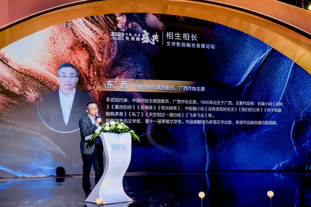 廣西作家協會主席、第十屆茅盾文學獎獲得者東西,在論壇上發表《小說負責開疆拓土 影視負責做大做強》的主題演講。作家東西稱,小說改編為影視作品,必須確保小說創作的傳統,即塑造人物、情節遞進、邏輯嚴密、臺詞精彩等。好的影視作品提醒創作者必須保留寫作的基本項,基本項是收視率的保證。如何做到小說和影視作品雙贏?那就是小說負責開疆拓土,影視負責做大做強。