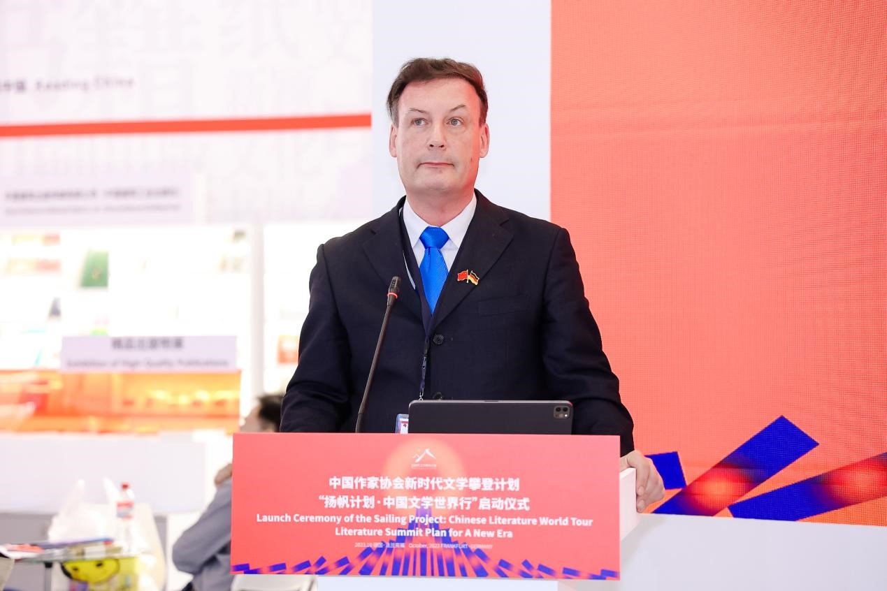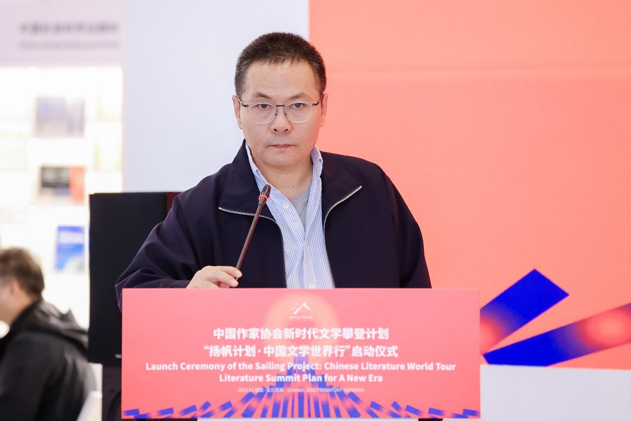 10月19日,在法蘭克福舉行的“新時代文學攀登計劃·揚帆計劃”之“中國文學世界行”啟動儀式暨圖書版權簽約儀式上,來自中外的出版人和作家匯聚一堂,打造中國作家海外傳播集群,促進形成中國文學圖書版權輸出矩陣,講好中國故事,讓海外通過中國當代文學了解可信、可愛、可敬的中國形象,推動中國文化更好地走向世界?;顒蝇F場,法蘭克福書展副主席柯樂迪,中國駐法蘭克??傤I館總領事黃昳揚,中國作家協會副主席李敬澤,中宣部出版局局長馮士新,中國作家協會創研部主任何向陽,中國出版集團有限公司黨組成員、中國出版傳媒股份有限公司副總經理張紀臣,中國圖書進出口(集團)有限公司總經理林麗穎共同啟動 “新時代文學攀登計劃·揚帆計劃”之“中國文學世界行”項目。