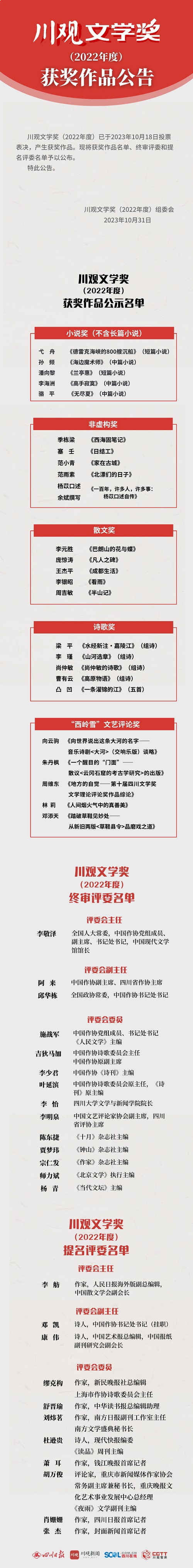 10月31日,川觀文學獎(2022年度)組委會發布公告稱,川觀文學獎(2022年度)獲獎作品已于2023年10月18日評選產生,并于10月27日至10月30日進行公示,共有25件作品分獲川觀文學獎(2022年度)小說獎(不含長篇小說)、非虛構獎、詩歌獎、散文獎、“西嶺雪”文藝評論獎。據了解,2022年度川觀文學獎頒獎典禮將于今年底在成都舉行。