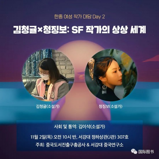 此次中韓科幻作家對話交流活動分為兩場,主題分別是 “科幻作家的創作世界”和 “科幻作家的幻想世界”。中國科幻作家程婧波分別同韓國科幻作家金草葉、金青橘對話,兩場活動都由韓國翻譯家和作家金依莎主持,當地中國文學研究者、出版社代表及對中國語言、文化、科幻作品感興趣的讀者近80人參加。