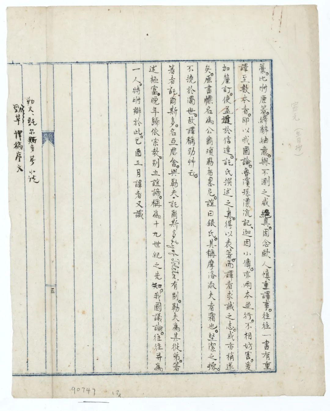 1.《〈勁草〉譯稿序文》:《勁草》是俄國阿·康·托爾斯泰所著歷史小說,現譯《謝歷勃里亞尼公爵》。約1907年冬,周作人從英譯本轉譯,由魯迅修改謄正,該譯稿遺失未印行,僅存魯迅以“譯者”身份代作的序言殘稿1葉(見插圖),落款時間為己酉三月,即1909年4月至5月。稿紙中縫標“五”,應是文章葉序。手稿上還有周作人手書說明此為《勁草》譯稿之序。使用十二行藍欄稿紙,這種稿紙在現存魯迅手稿中比較少見。本手稿是國圖藏寫作時間最早的魯迅創作手稿。