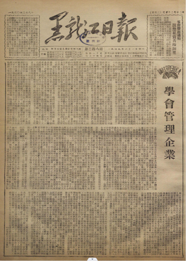 利用這些簡陋殘缺的設備,他們抓緊開展了印刷廠修復工作。同時跑省工委、省人民政府、省軍區采寫新聞,并用僅有的一臺收音機抄收延安新華廣播電臺的新聞……12月1日,中共黑龍江省工委機關報創刊了。這一天,該報社的社牌也正式掛出。