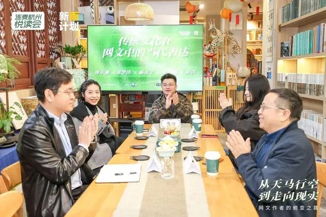 11月12日上午,浙江省作協副主席、浙江省網絡作協副主席管平潮,咪咕數媒總編輯張學偉,知名網絡作家瘋丟子、王巧琳,青年作家蔣話齊聚曉風·明遠書店,結合個人的創作、編輯經驗,共同圍繞著“傳統文化在網文中的當代表達”主題進行研討,探索中華優秀傳統文化與網絡文學融合的邊界與路徑。