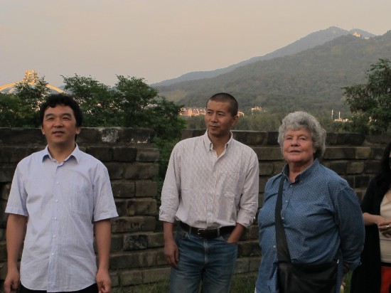 拜厄特(右)、畢飛宇(中)和原譯林總編輯劉鋒2012年的合影,背景為玄武湖的城墻。攝影:于魁潮