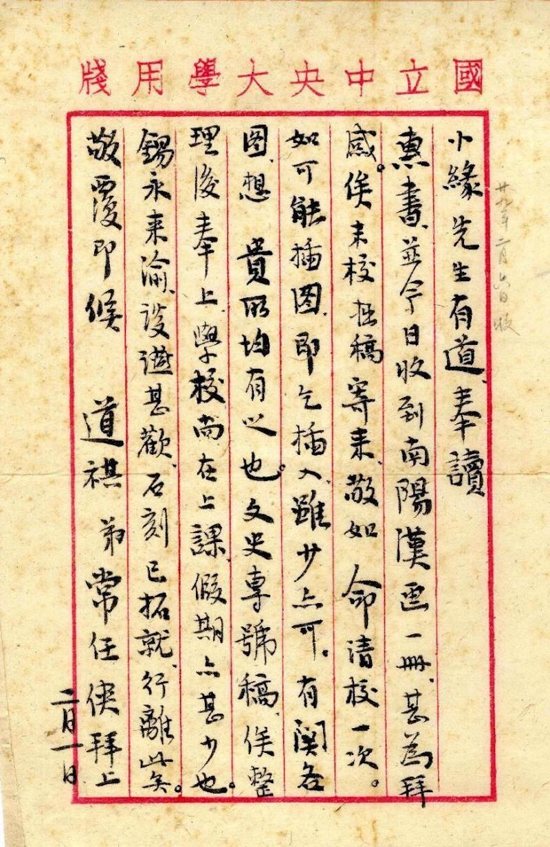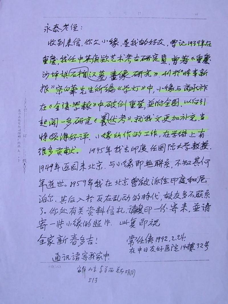 收到來信,你父小緣,是我的好友。曾記1939年在重慶,我任中英庚款藝術考古研究員,曾著《重慶沙坪壩漢墓石棺畫像研究》,刊于《時事新報》宗白華先生所編《學燈》中,小緣與商承祚在《金陵學報》中破例重登,并附全圖,以后引起聞一多研究《伏羲考》,就我文更加補充,當時頗得好評。小緣所作的工作,在學術上有很多貢獻。1945年我去印度,任國際大學教授,1949年返國來北京,與小緣即無聯系,不知其何年逝世。1959年我在北京曾被派往印度和尼泊爾,其后入于反右動亂的時代,故友多不聯系了。你處有關資料信札,請復印一份寄來,并請寄一張小緣的照片。此復,即祝